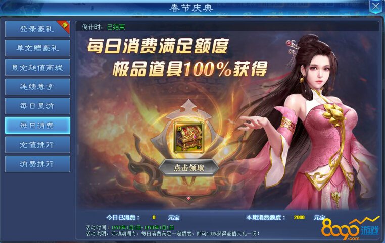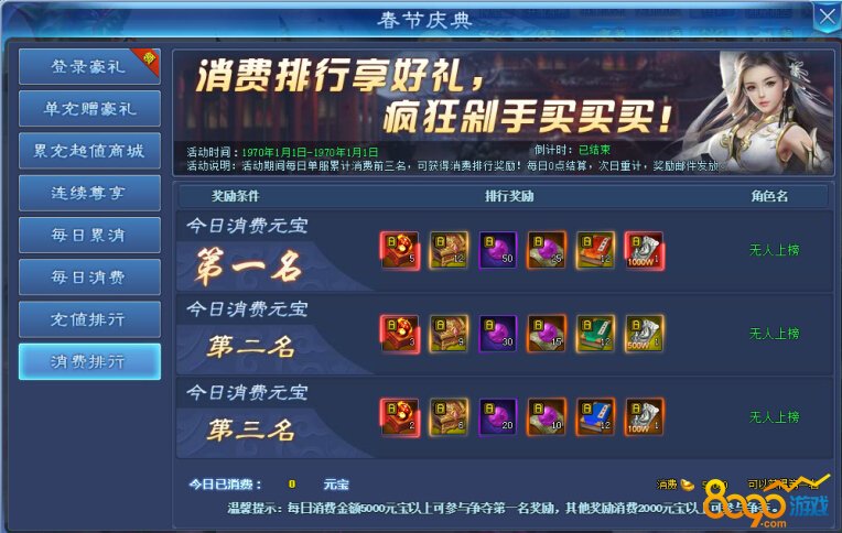 活动说明:活动期间每日单服累计消费前三名,可获得消费排行奖励!每日0点结算,次日重计,奖励邮件发放。