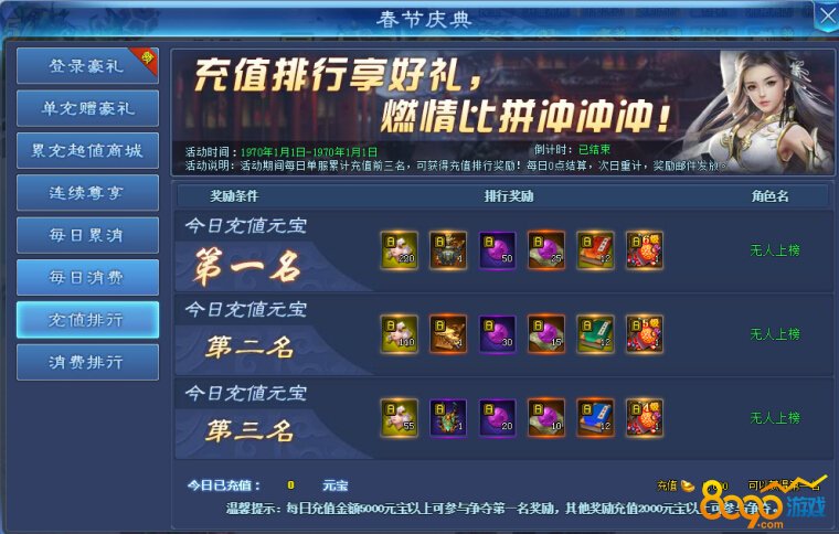 活动期间每日单服累计充值前三名,可获得充值排行奖励!每日0点结算,次日重计,奖励邮件发放。
