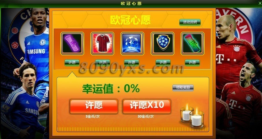 左三大奖:欧冠之魂*5,每次许愿仅需25金币;