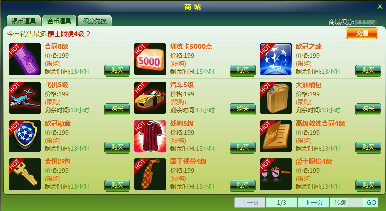”金币商城首页陈列12件HOT道具,每件价值199金币,每人每件道具限购1个。
