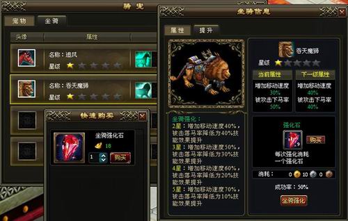 坐骑星级提升需要坐骑强化石,每天的祖龙刷怪任务中会送若干个强化石,坐骑满星为5级。每提升一级,坐骑移动速度提高一定的百分点,同时,坐骑的被攻击落马率减小相应的百分比。落马率在战场上特别重要,危险关头在敌人猛烈攻击下骑马逃脱的梦想,只要提升坐骑星级就可以实现。
