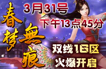2012年3月31日13:45开启双线16区--"春梦无痕"!丰厚的开服游戏活动,闪亮的游戏内容,无一不在期待您的参与! 还等什么,火速加入吧!!!