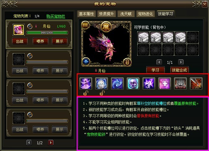 宠物技能学习:紫色区域为学习规则,红色区域为技能栏。下图为未学习技能时的技能栏状态。