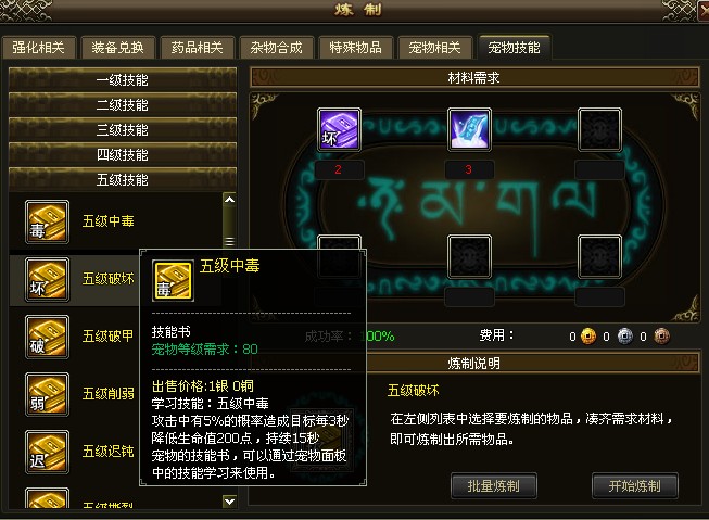 玩家可以打开炼制,点击宠物技能,20个宠物技能残卷可以合成一个一级技能。2个一级技能加3个宠物技能合成符可以合成一个二级技能。2个二级技能书加三个宠物技能合成符可以合成一个三级技能。以此类推,目前最高的是五级技能。