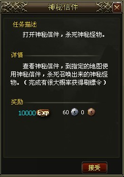 小信箱每天会给玩家五封信,到指定地图,到了地图后打开信件,会出现一只神秘怪物,打死怪物后回去交任务,会获得不菲的钱币报酬呢。
