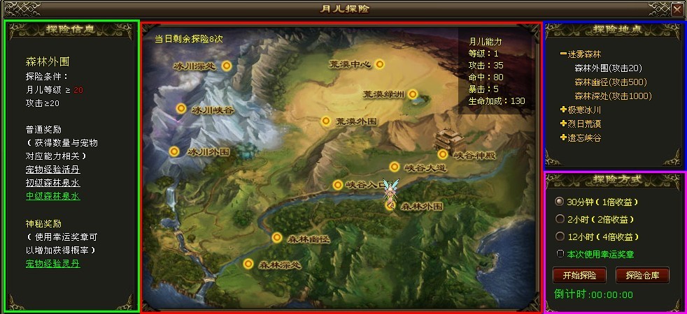 进入标准以月儿的等级和某种属性为标准,达到后就可以进入。探险完毕可以获得奖励(包括普通奖励和神秘奖励),获得的奖励和宠物属性有关、宠物属性越高获得的物品数量越多,使用幸运奖章可以增加神秘奖励的获得概率。