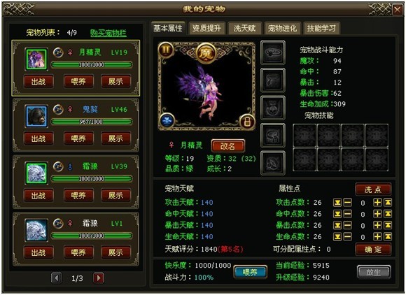 除了月儿(剧情获得)之外,其他宠物主要通过使用“宠物精元”而获得。