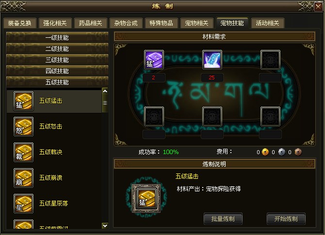 宠物技能书可以通过合成获得更高等级的技能书。在炼制中点击宠物技能。合成的材料都可以在宠物探险中获得