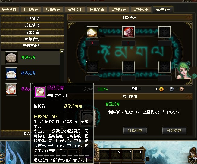 击杀野外以及各个副本中的怪物,可以获得“糯米粉”“白糖”“芝麻”“豆沙”“果仁”五种材料,在“炼制”中,使用不同的搭配,可以做出不同的元宵。
