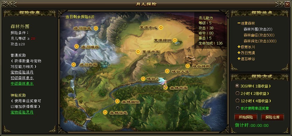 飘渺雪域宠物探险怎么玩 宠物探险攻略详细介绍 目前新开放的宠物探险,很多玩家都不太了解,其实这个功能目前只对月儿开放。真心觉得这点做的不错啊,还好不是只对什么熊猫开放,我是穷人,买不起熊猫身上只有月儿。 点击进入宠物界面后选择月儿后在右下角可以进入探险界面。目前只开放了3张地图迷雾森林、极寒冰川、烈日荒漠 ![]() 迷雾森林中可以获得宠物经验丹,获得的经验都很高。战斗时获得的森林泉水可以合成宠物仙露,可以让月儿获得的经验加倍。 在探险中还能获得宠物技能残卷,宠物技能合成符,圣兽仙丹,宠物宝石碎片,新云奖章碎片,宠物进化石。 而且现在的宝宝装备也可以上宝石了,可别装备上石头闪亮亮,宝宝却穿的毫无光彩。