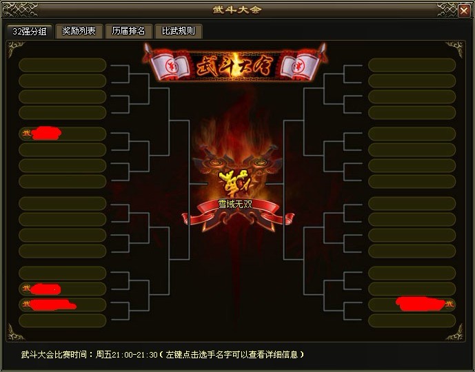 入围规则: 1. 上一届武斗大会前四名可直接入围. 2. 每周五0点战斗力排名靠前的玩家补齐32强 3. 入围玩家随机进行分组 武斗规则: 1. 比赛过程中退出及掉线均视为弃权. 2. 限定时间内击杀对手次数较多的玩家获胜,击杀相同则先杀者获胜. 3. 双方均未击杀对方则系统随机判定胜者 更多资料请进入8090官网:pmxy.8090yxs.com |