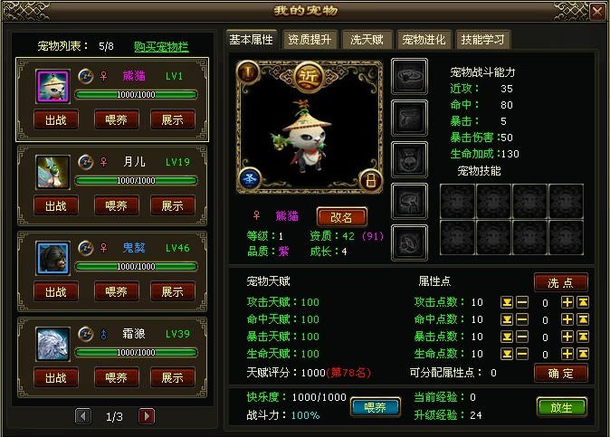 【活动内容】全服限量供应“熊猫礼包”内含紫色神宠熊猫和宠物群攻技能书“惊雷闪”。拥有神力的紫色品质熊猫超凡脱俗,具有比蓝色品质宠物更高的攻击和血量加成。超强群攻技能“惊雷闪”,更是你宠物杀人PK的终极利器,还等什么,快点抢购吧~~~