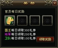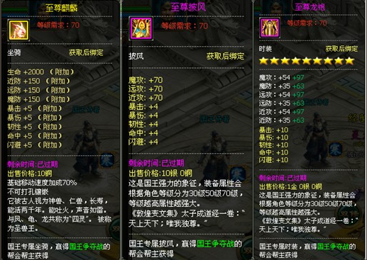 4.国王可获得华丽时尚的国王专属套装。装备等级根据帮会内帮主等级决定,30-49可以领取30级套装。50-69可以领取50级套装。70以上可以领取70套装。