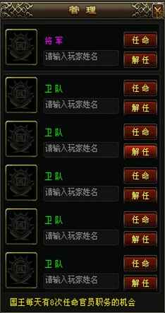 5.国王可以设置国家官员,官员可以每天领取官员奖励。奖励需要在设置后第二天才能够领取,其中包括国王的奖励。国王每天有8次设定官员的机会。设定后可以对官员进行卸任。