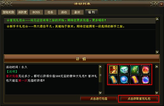 问:价值600元宝的首充礼包在哪里领取? 答:首次充值后,点击游戏界面右上角的“活”字打开活动界面,选择“福利”—>“点击获取首充礼包”即可获得包括黄金小飞鞋、炼骨丹等共价值588元宝的首充礼包。 图: