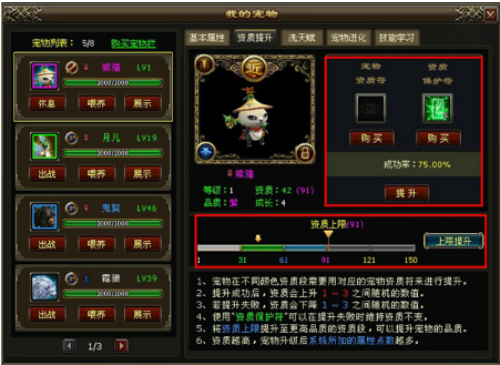 宠物的资质上限决定宠物的品质,使用资质符可提高宠物的资质上限,资质上限越高对应的提高资质的成功率会降低,购买资质保护符可以在提升失败时维持资质不变。