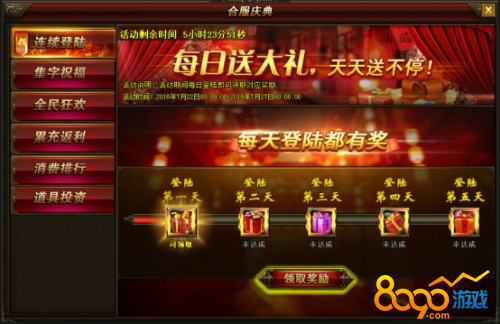活动内容:每日登录才计算入当前登录天数,逾期则总奖励少一档(如:玩家第一天登录,第二天未登录,第三天再次登录只可领取第二天奖励)