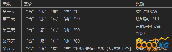 活动内容:收集特定【合】【服】【庆】【典】【定情石】(前四个刷怪掉落【定情石】只可在界面中购买)等字符,兑换7档奖励
