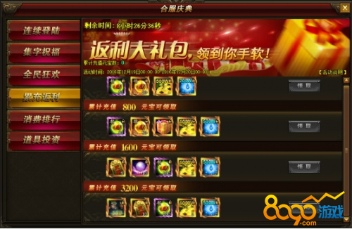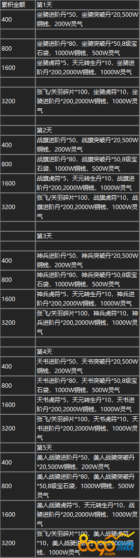 每日共4档充值返利,分别为充值:400、800、1600、3200元宝