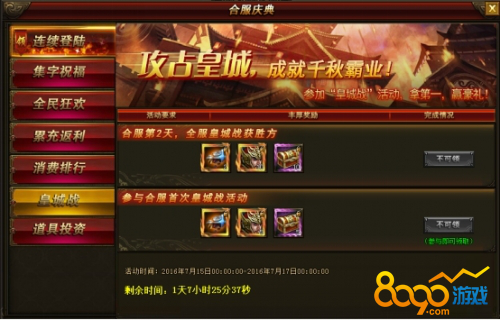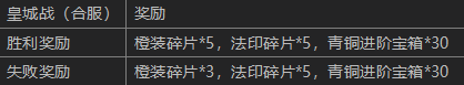 活动内容:合服后只有第二天才开放皇城战,活动过后胜方和败方都可领取到额外的奖励(活动结束后即可领取)