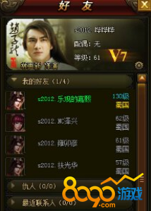 人在江湖混,怎能没有几个出生入死的兄弟姐妹!8090《倾国之怒》在游戏界面右上方点击“友”字按钮可打开好友界面。