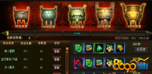 活跃度界面显示了当天游戏里各类玩法完成的情况,包含副本,任务,提升装备等等。完成各种玩法可获得对应的活跃度,活跃度累积到一定值可领取当天对应的奖励,活跃度每天清空,记得每天领取奖励哦!