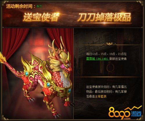 b.活动期间,每日12点、15点、18点、21点在雷霆城(84.149)位置会刷新送宝使者,送宝使者被攻击时,有几率爆出物品,最后被击败时,有几率掉落最高主宰套装。
