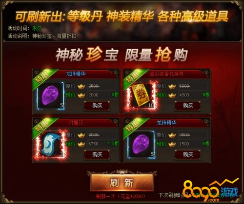 b. 活动期间内,每消耗2000元宝即可刷新一次,各种神秘珍宝随机刷新,超值折扣,限量抢购!