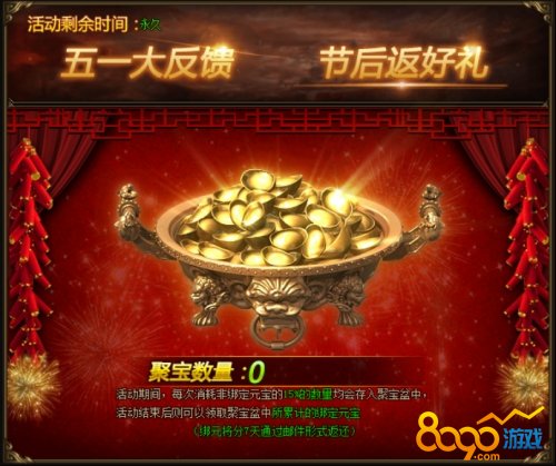 b.活动期间内, 每次消耗非绑定元宝的15%均会存入聚宝盆中,活动结束后则可以领取聚宝盆中所累计的绑定元宝,绑元将分7天通过邮件形式返还。