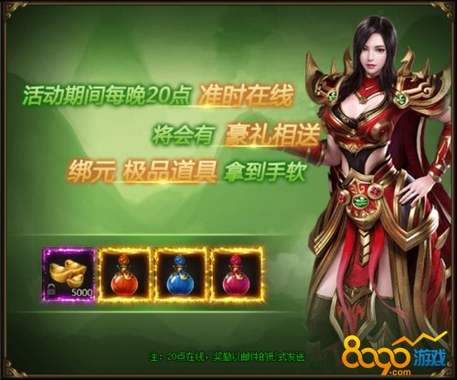 b.活动期间内,每晚20点准时在线,将会有豪礼相送,绑元、极品道具拿到手软!