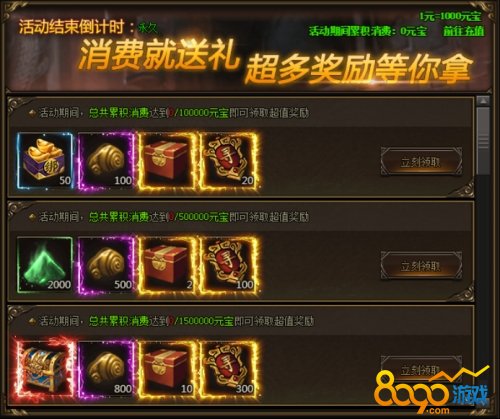 1)累计消费100000元宝:绑元盒X50,生肖碎片X100,神技大礼包X1,超级装备兑换卷X20