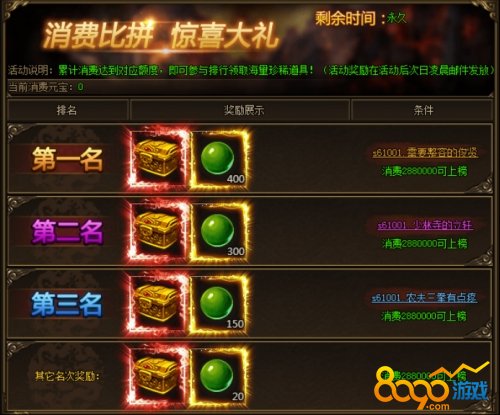 b.活动期间内,消费达到2880000元宝即可上榜参与排行,前3名可领取超级大奖!