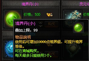 吃境界丹,在绑定元宝商城购买境界丹,每天限使用5个,共计获得5万点境界值。