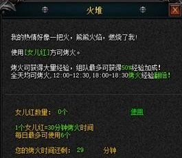 玩家想要开启双倍经验就要去土城坐标(94.71),那边有一堆火,在火堆旁使用女儿红就能吃到30分钟烤火时间,而玩家组队烤火更能额外获得50%的经验加成,小编建议玩家在中午的12:00--12:30和晚上的18:00—18:30烤火,这时候烤火的经验会是原来的两倍。