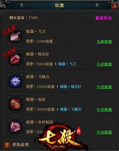 这么好的属性,兑换却简单暴力只要杀神系统达到了名动一阶,玩家才能使用能量来兑换一级的暗器。之后想要提升暗器,只需要花费一定量的能量值就可以了。