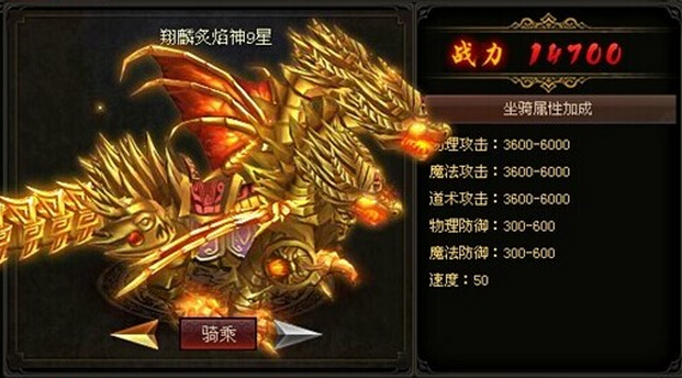 翔麟炙焰神是未来玩家将能够获取的新一代坐骑之王,拉风的三头龙造型和纯金色外面都给人感受到其强大的战力,而9星的它更能提供玩家1W4700的战力堪称绝品。