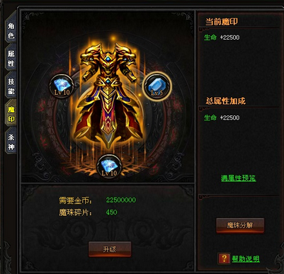 在人物属性界面下方就能进入魔印系统,魔印是玩家增加主属性的最佳方式。魔印解封条件:人物等级达到60、65、70级分别可解封第1、2、3个魔印,激活每个魔印需要花费魔珠碎片和金币。只有解封的魔印才能进行激活和升级操作。已激活的魔印即可消耗一定数量的魔珠碎片和金币即可进行升级,魔印最高可升级到10级哦!