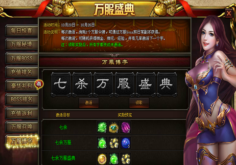同时活动页面上还特殊的BOSS召唤令的存在。玩家能够在BOSS掉落中找到相关的字符,每次消耗1个万服令牌,可通过万服boss和日常副本获得。每次激活,可随机获得绑金、绑元、经验,并有几率激活下一个字。注:领取奖励后,所有字都变成未激活。