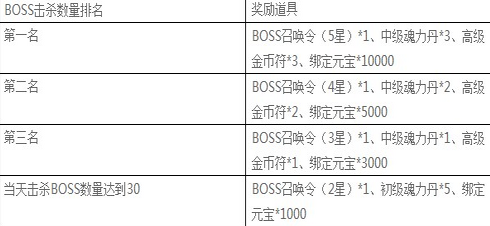 新出的万服BOSS是现在掉落最好的BOSS之一了,每天击杀boss数量达到50的玩家,即可领取一份奖励;每天击杀boss数量排名前3的玩家更可获得丰厚奖励!排名奖励通过邮件发放!也就是说每天你只要击杀30个BOSS及以上就最少能获取2个召唤万服BOSS的权利。