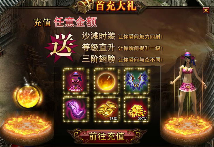 奖励内容:等级直升丹(70级之前可升一级)、沙滩时装*1、屠兽羽翼(3档)、超级经验符、1888绑定元宝、200万绑定金币。