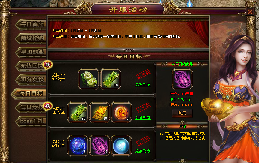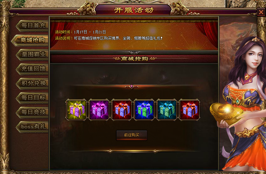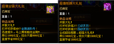 活动内容:可在商城促销专区购坐骑、境界、翅膀、法器、成就、灵元等超值大礼包