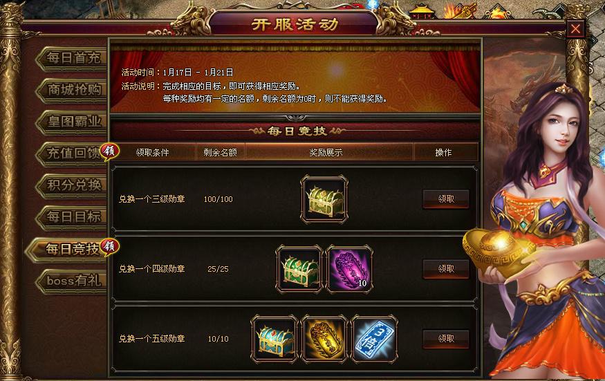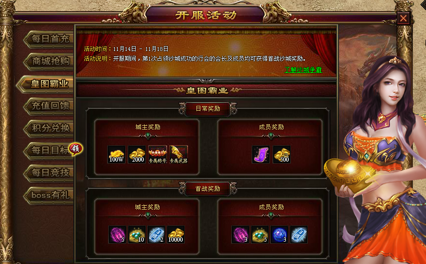 活动内容:开服前5天,第1次占领沙城成功的行会的会长及所有成员均可获得首站沙城奖励