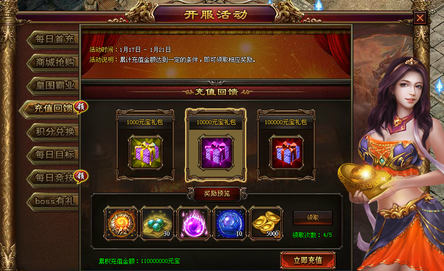 活动内容:累计充值金额达到一定的条件,即可领取相应奖励,每种礼包领取次数上限为5次,(如累计充值金额达到600000元宝)可领取100000元宝奖励5次,10000元宝奖励5次和1000元宝的奖励5次