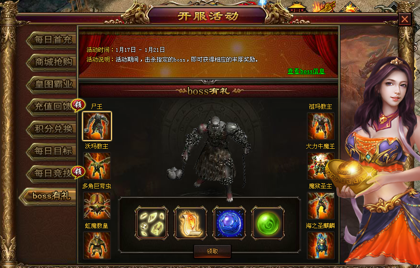 活动内容:活动期间,击杀指定目标BOSS即可领取对应奖励1次,每种奖励只可领取1次