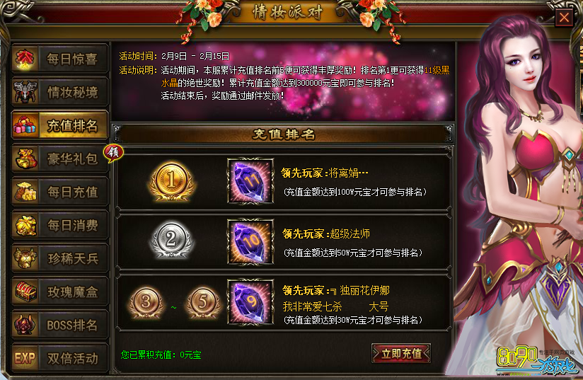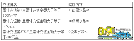 【活动内容】:本服累计充值排名前5即可获得丰厚奖励!排名第1更可获得11水晶的绝世奖励!累计充值金额达到300000元宝即可参与排名!活动结束后,奖励通过邮件发放!