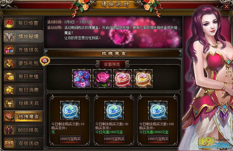 【活动内容】: 活动期间购买玫瑰魔盒,开启必得蓝色妖姬,更有几率获得妖姬妖盒和妖姬魔盒!让你的亲密度任性到底!