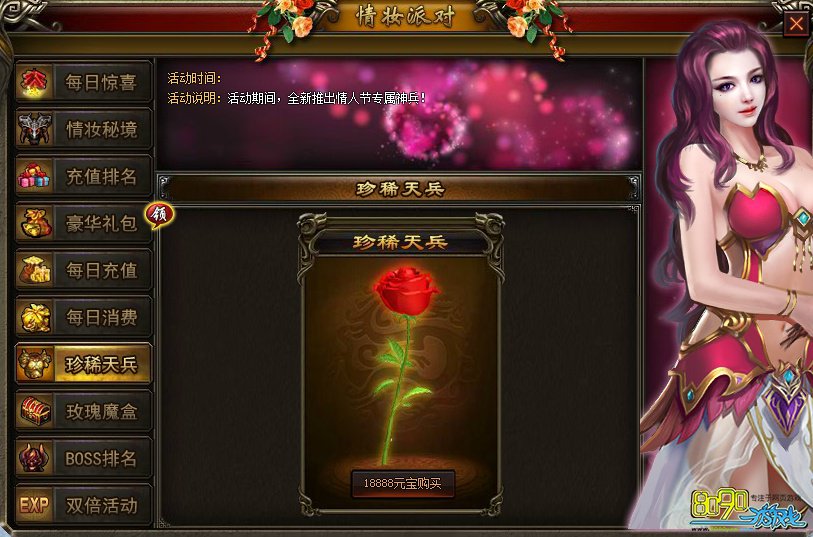 【活动内容】:向你的TA表达爱意吧,玫瑰玫瑰我爱你,至臻典藏绝版天兵-花溪带回家,还有狂热天蝎、灵魂战车等幻化坐骑和天下无双称号!探宝时部分装备和道具的概率还翻倍噢!