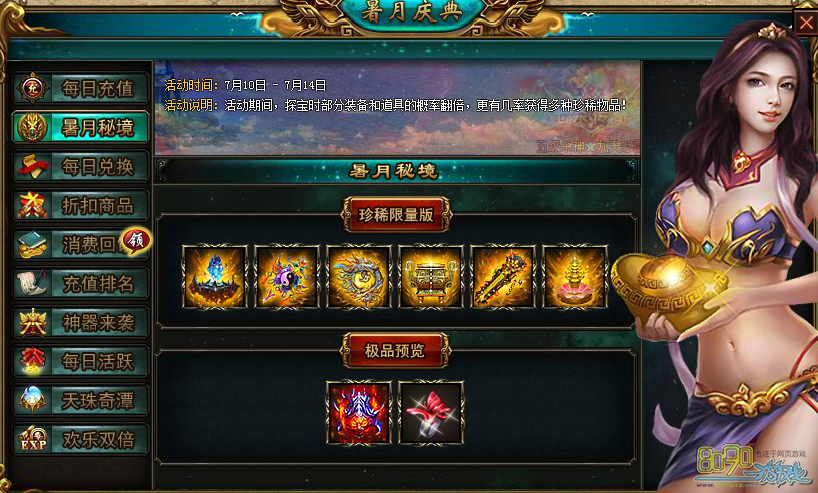 【活动说明】:活动期间,探宝时部分装备和道具的概率翻倍,有几率获得多种珍稀道具!