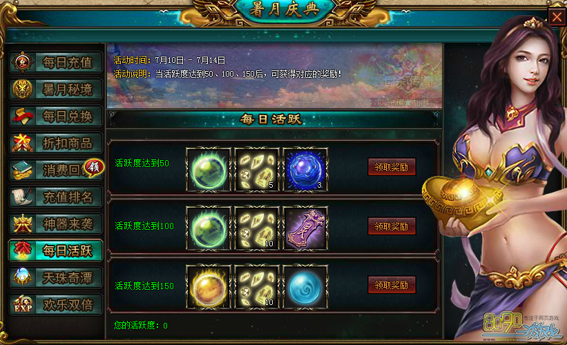 【活动说明】:当活跃度达到50、100、150后,可获得对应的奖励!