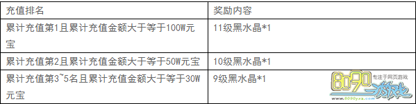 【活动说明】:活动期间,本服累计充值排名前5名便可获得丰厚奖励!排名第1更可获得11级黑水晶的奖励!累积充值300000元宝即可参与排名!活动结束后,奖励通过邮件发放!